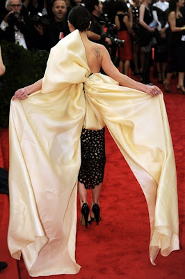 Christina Ricci in Thakoon: Well, well, well, I decided to wrap my Met Gala Red Carpet BLOG postings with a BIG BOW. As in--take a look at Christina Ricci's oversized silk organza back bow! This dress, by Thakoon, designed by Thakoon Panichgul (who was her date incidentally) featured a below-the-knee, laser-cut embroidery/applique silhouette and then an exuberant organza neckline ruffle that then ended up in THAT big ol' bow. I can't imagine how much tulle is stuck inside that bow to hold it up! This seriously looks like a sketch/design I would have done when I was ten before I realized I had to design for real women!! Somewhere in the World a fierce Drag Queen is mad at herself for not thinking--or designing--this out-of-control dress.
